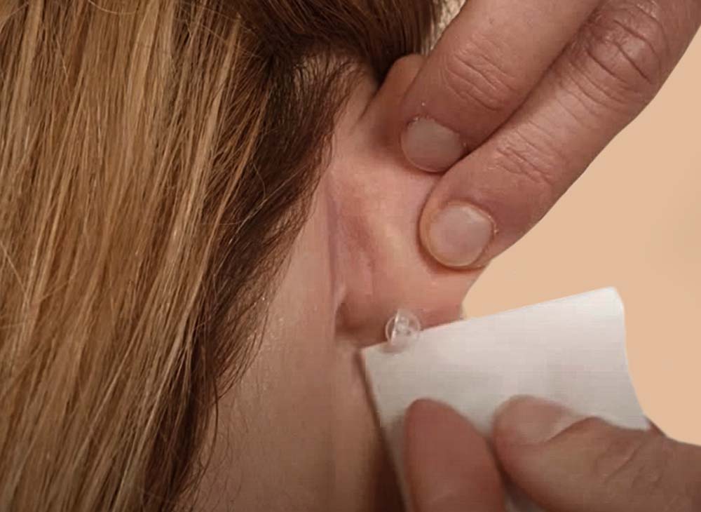 Cleanse the new piercing in your ear thoroughly in front and in back, morning and evening. Keep the earrings in your ear, even during cleansing.