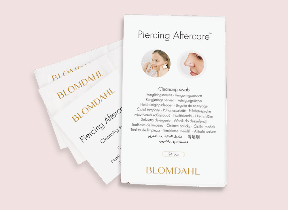 For cleansing at other times, use Blomdahl Piercing Aftercare cleansing swabs, which are gentle to the skin. You can use them to cleanse between the ear and the earring/earring back. Allow to air dry. Use a new cleansing swab for the other ear, as well as new swabs the next time you cleanse the piercings. Note! Do not cleanse using alcohol.